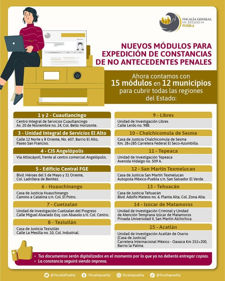 - ¿El certificado tiene una fecha de vencimiento? No, el certificado de antecedentes no penales en Puebla no suele tener fecha de vencimiento.