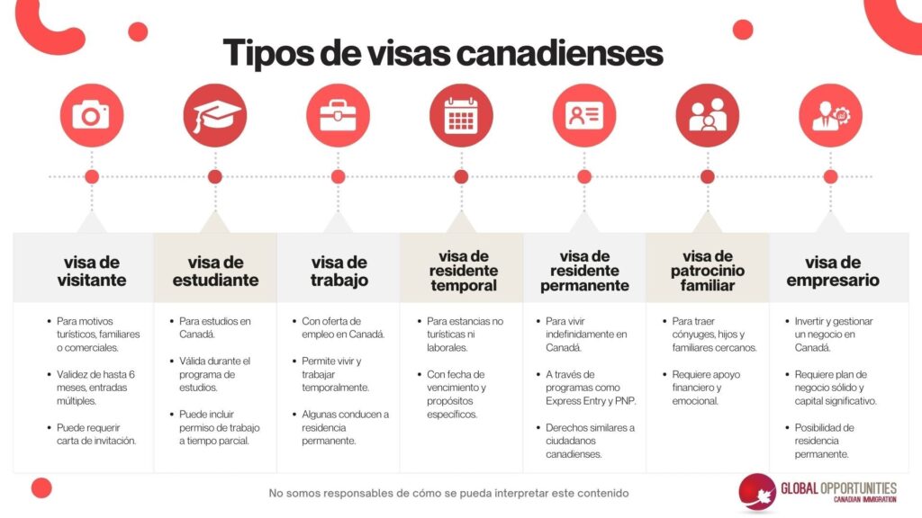 Hay otros tipos de visas, como las de negocios o inmigración. Cada una tiene requisitos específicos, y es fundamental investigar qué tipo de visa se adapta mejor a tus planes. Recuerda que la información en este artículo es una guía general, y siempre debes verificar los requisitos específicos en la página web oficial del gobierno de Canadá.